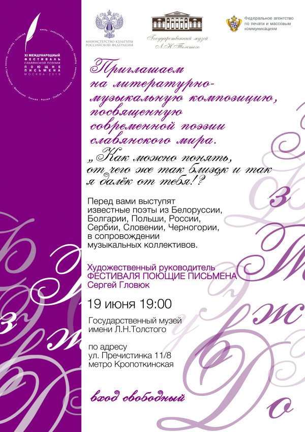 19 июня, 19.00 Государственный музей Л.Н. Толстого (ГМТ). Литературная экспозиция на Пречистенке. Ампирный зал Москва, ул. Пречистенка, д. 11/8 (м. «Кропоткинская»)   С 17 по 20 июня в Москве пройдет XI Международный фестиваль славянской поэзии «ПОЮЩИЕ ПИСЬМЕНА». Традиционно на него соберутся поэты из разных славянских стран: Белоруссии, Болгарии, Польши, Сербии, Словении, Черногории, России. 19 июня…