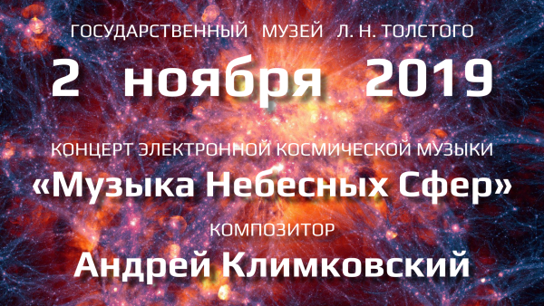 2 ноября 2019 г. 18.00 Государственный музей Л.Н. Толстого (ГМТ). Литературная экспозиция на Пречистенке. Малый зал Москва, ул. Пречистенка, д. 11/8 (м. «Кропоткинская»)Справки о билетах по телефону: +7 (926) 719 19 00 Цикл вечеров «Музыка в доме Толстого» МУЗЫКА НЕБЕСНЫХ СФЕР Вечер композитора Андрея КЛИМКОВСКОГО www.neane.ru www.klimkovsky.ru www.klimkovsky.com