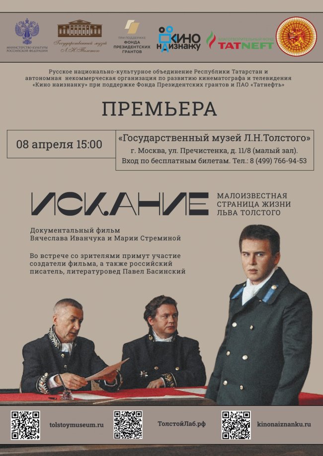 8 апреля (четверг), 15:00 Пречистенка, 11. Малый зал Цикл «Литературная гостиная» Премьера документального фильма «ИСКАНИЕ» (малоизвестная страница жизни Льва Толстого) Режиссеры: Вячеслав Иванчук, Мария Стремина Просмотр и обсуждение фильма. Во встрече со зрителями примут участие режиссеры фильма, а также российский писатель, литературовед и литературный критик, член Союза российских писателей Павел Басинский. Вход по бесплатным…
