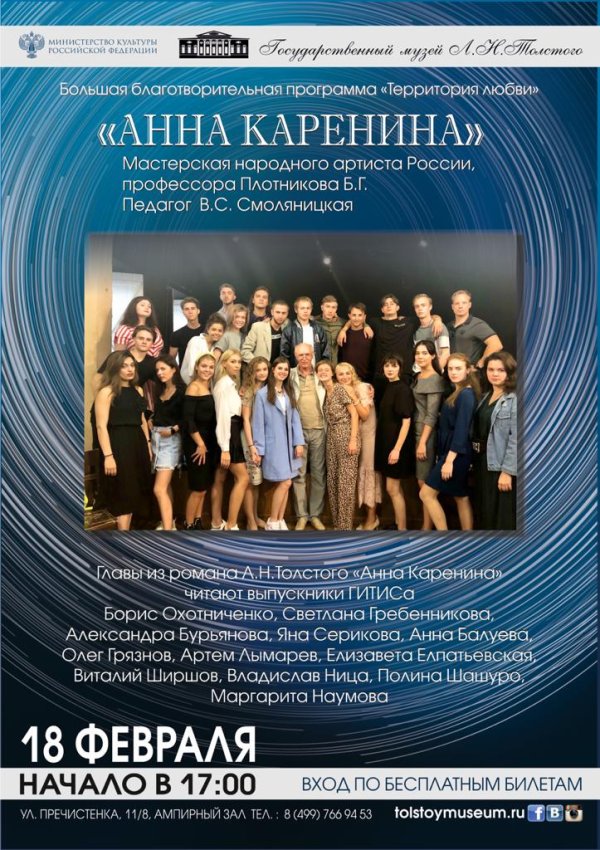 18 февраля (четверг), 17:00 Пречистенка, 11. Ампирный зал Большая благотворительная программа «Территория любви» Мастерская народного артиста России Б.Г. Плотникова. Педагог В.С. Смоляницкая.   Главы из романа Л.Н. Толстого читают выпускники ГИТИСа Борис Охотниченко, Светлана Гребенникова, Александра Бурьянова, Яна Серикова, Анна Балуева, Олег Грязнов, Артем Лымарев, Елизавета Елпатьевская, Виталий Ширшов, Владислав Ница, Полина Шашура, Маргарита Наумова.…