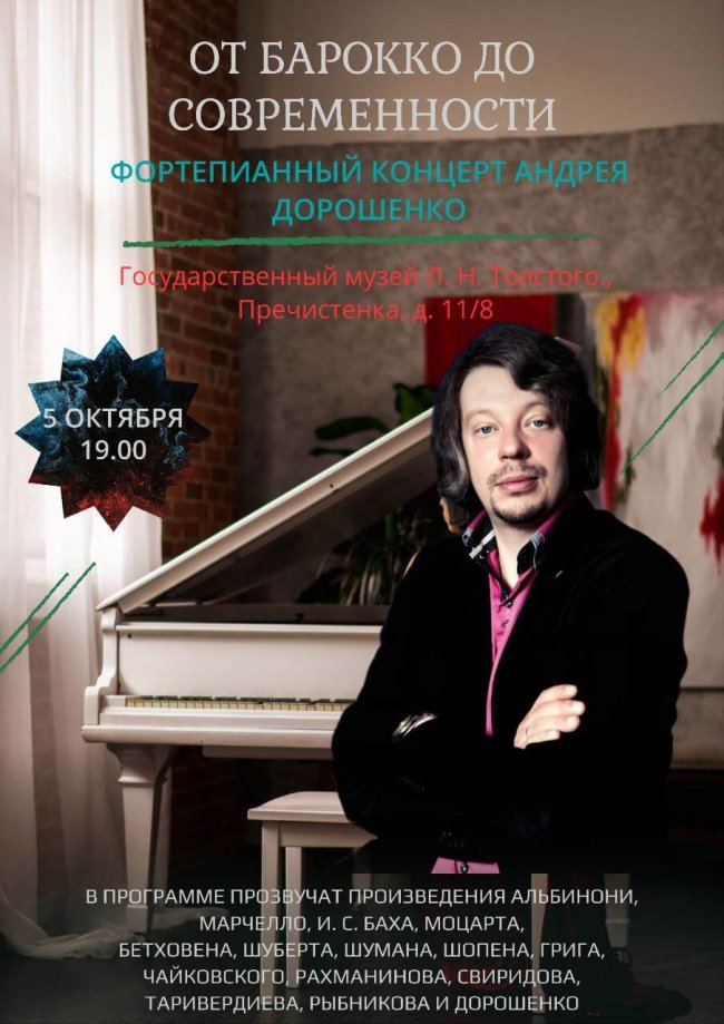 5 октября (четверг) 2023 года, 19:00 ул. Пречистенка, 11/8, Ампирный зал Цикл вечеров «Музыка в доме Толстого» Справки о билетах по телефону: +7(915)227-70-57 Фортепианный концерт Андрея ДОРОШЕНКО. В программе произведения Бетховена, Моцарта, Шопена, Шумана, Грига, Чайковского, Рахманинова, а также современных композиторов.