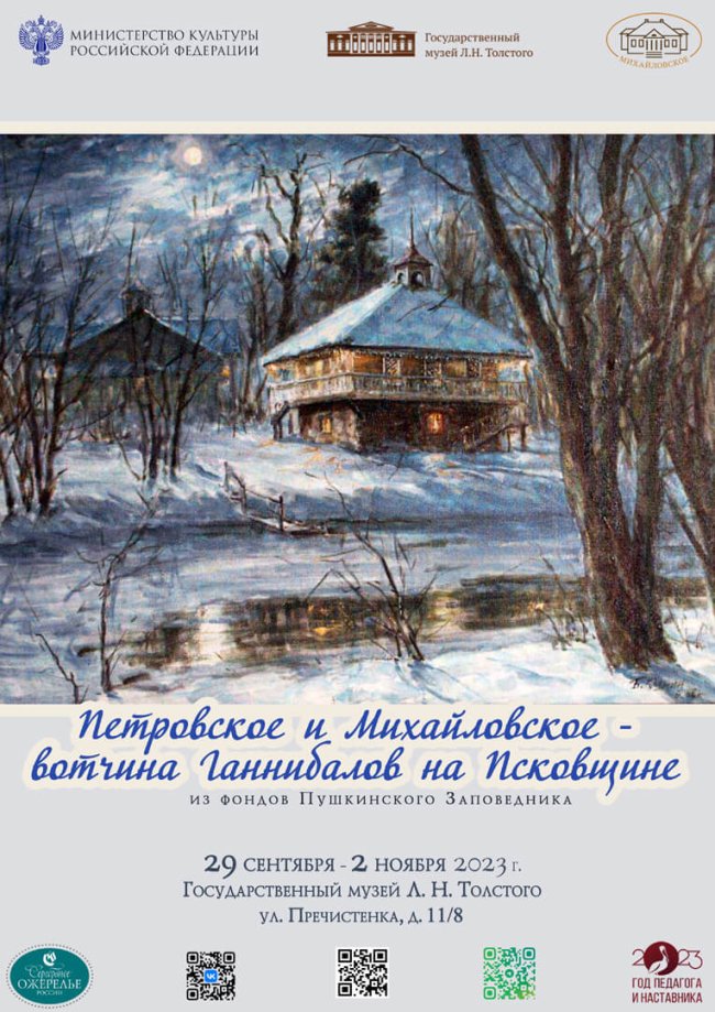 до 30 октября (понедельник) 2023 года Государственный музей Л.Н. Толстого (ул. Пречистенка, д.11/8) Информируем о том, что в Государственном музее Л.Н. Толстого на ул. Пречистенке на следующей неделе закрывается выставка «Петровское и Михайловское — вотчина Ганнибалов на Псковщине (из фондов Пушкинского заповедника)». Увидеть экспозицию можно до 30 октября.
