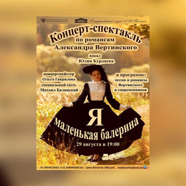 29 августа 2023 года (вторник), 19.00 ул. Пречистенка, 11/8, Ампирный зал Цикл вечеров «Музыка в доме Толстого» Цена билета: 600 рублейКупить билеты Дорогие друзья! 29 августа в 19:00 приглашаем вас на концерт Юлии Курдяевой «Я маленькая балерина» по романсам А. Вертинского. Концерт состоится в Ампирном зале ГМТ, в котором сейчас проходит выставка, посвящённая художнице Елизавете…