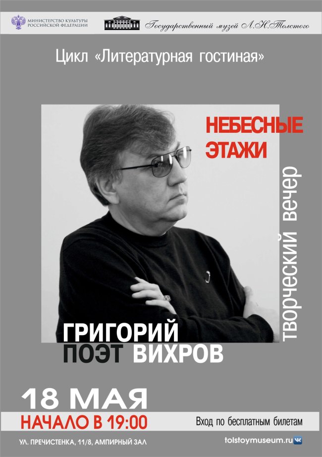 18 мая 2023 года (четверг), 19:00 Государственный музей Л.Н. Толстого (ул. Пречистенка, 11/8, Ампирный зал) Вход по бесплатным билетам Григорий Вихров — российский поэт, преподаватель и искусствовед, Член союза писателей СССР/РФ, победитель Всемирного фестиваля поэзии в Бельгии, лауреат международных конкурсов. Произведения Григория Вихрова переведены на семнадцать языков мира, на его стихи написаны песни и романсы. Поэт выступал с…