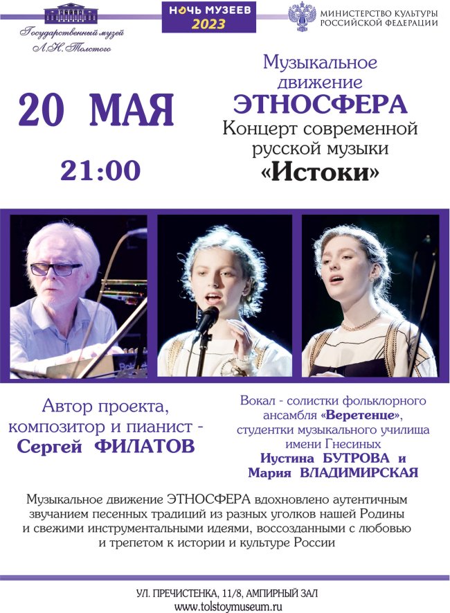 20 мая 2023 года (суббота), 21:00 ул. Пречистенка, 11/8, Ампирный зал Вход по бесплатным билетам Автор проекта, композитор и пианист Сергей Филатов. Вокал — солистки фольклорного ансамбля «Веретенце», студентки музыкального училища имени Гнесиных Иустина Бутрова и Мария Владимирская.   Музыкальное движение ЭТНОСФЕРА вдохновлено аутентичным звучанием песенных традиций из разных уголков нашей Родины и свежими инструментальными…