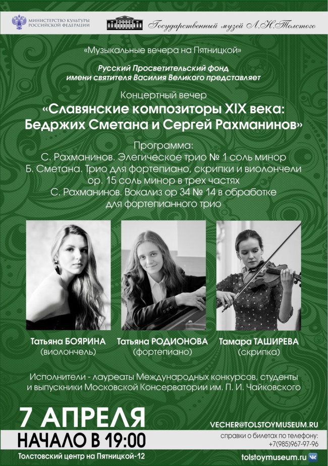 7 апреля 2023 года (пятница), 19:00 Толстовский центр на Пятницкой-12 Цикл вечеров «Музыкальные вечера на Пятницкой» Русский просветительский фонд имени святителя Василия Великого представляет концертный вечер «Славянские композиторы XIX века: Бедржих Сметана и Сергей Рахманинов». В программе: С. Рахманинов. Элегическое трио № 1 соль минор Б. Сметана. Трио для фортепиано, скрипки и виолончели ор. 15…