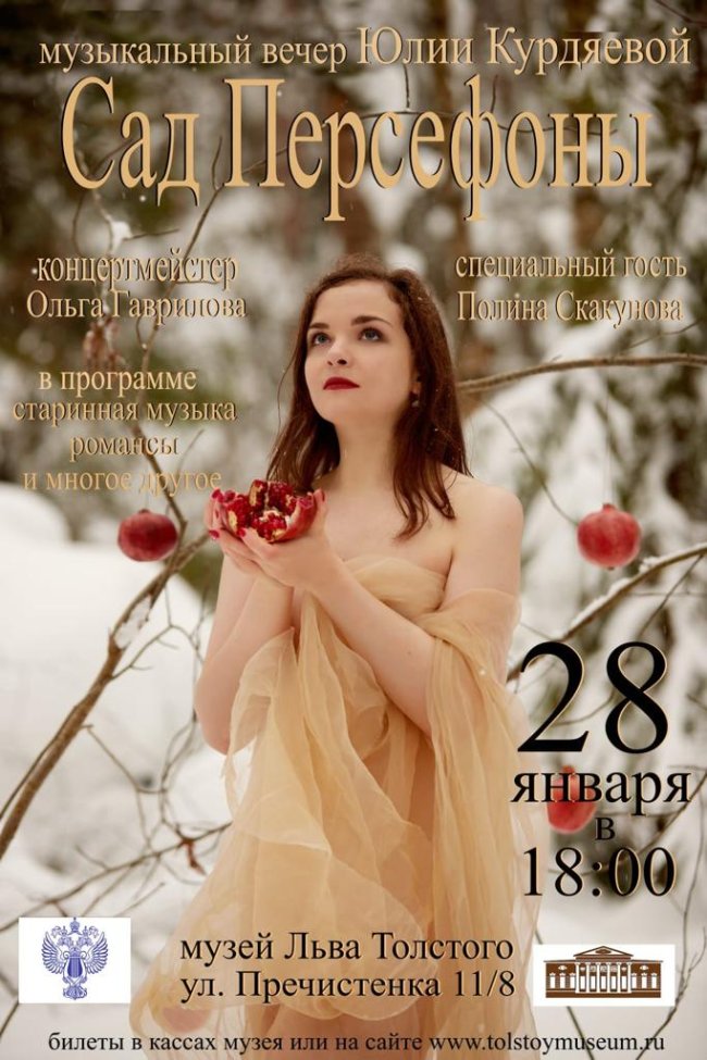 28 января (суббота), 18:00 Пречистенка, 11/8 Цикл вечеров «Музыка в доме Толстого» Музыкальный вечер Юлии Курдяевой (меццо-сопрано) Концертмейстер Ольга Гаврилова Специальный гость Полина Скакунова (сопрано) 28 января в 18:00 в Государственном музее Л.Н. Толстого состоится новый концерт лауреата всероссийских и международных конкурсов певицы Юлии Курдяевой (сопрано). В ее исполнении прозвучат бессмертные произведения…