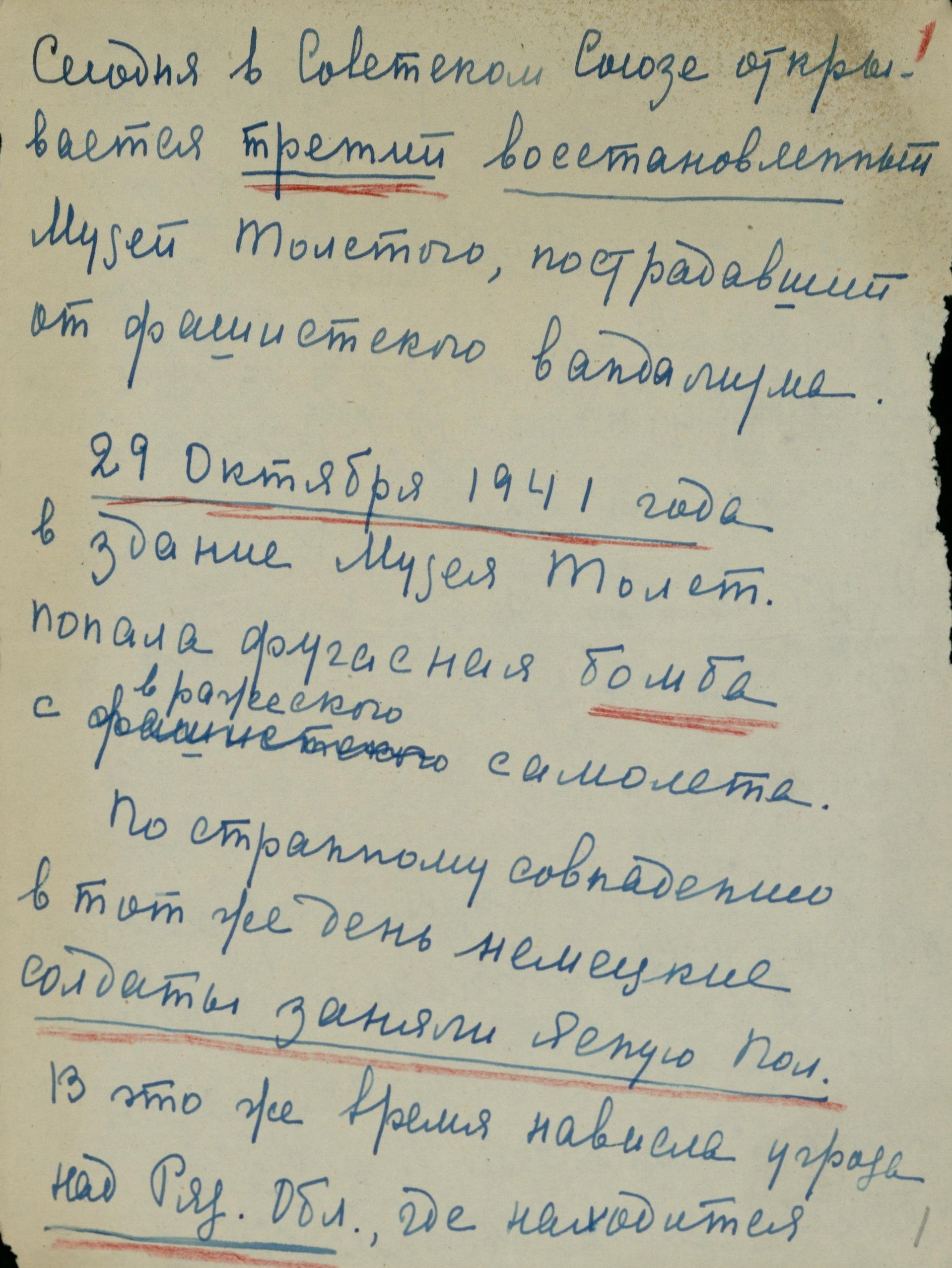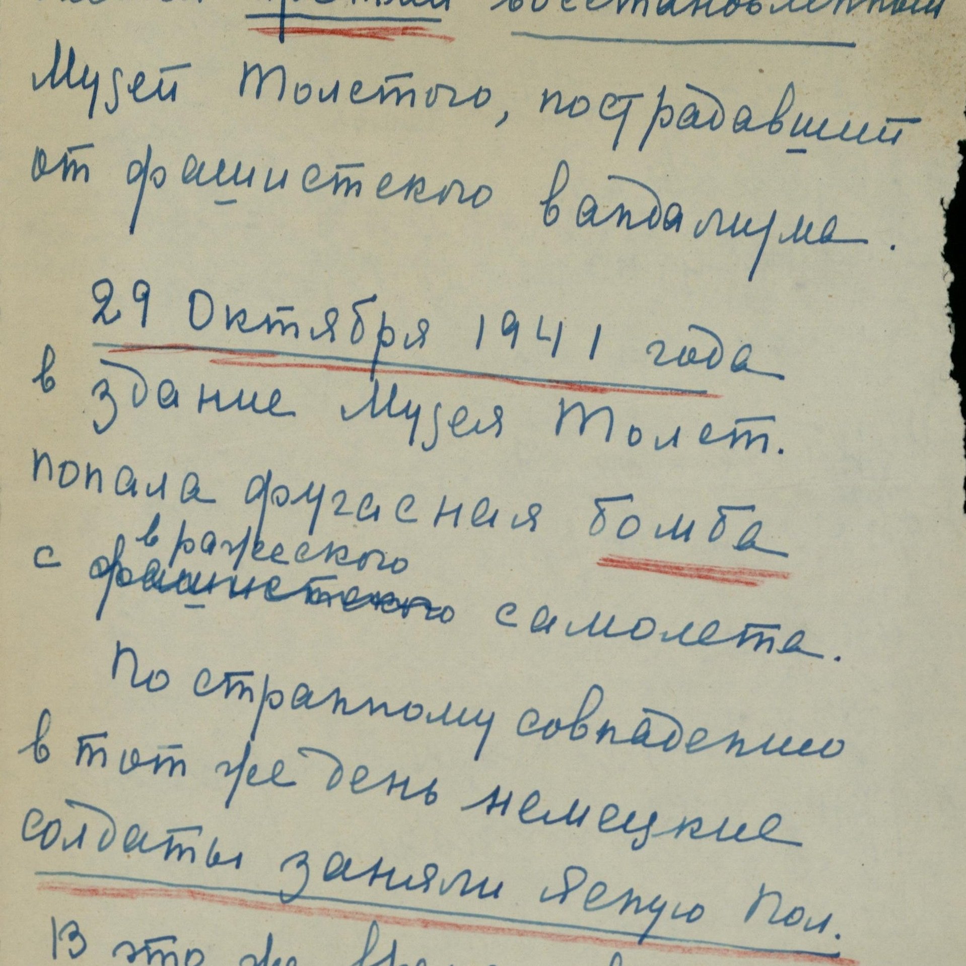 11 октября 1941 года начался 40-дневный путь в Томск 110 ящиков из Ясной Поляны. Первые семь дней эшелону угрожали бомбежки. В середине дороги, между станциями Кунгур и Свердловск, порвался эшелон, у вагона с экспонатами оборвались сцепления с обоих концов. Из-за ремонта задержались на неделю. Затем начались 30-градусные морозы, потребовалось оборудовать в вагоне печку, чтобы живописные полотна и сопровождающие люди не пострадали. 19 ноября вагоны прибыли в Томск. К этому времени Научная библиотека уже приняла на хранение прибывшее в августе из Москвы рукописное наследие русских классиков – Пушкина, Толстого, Горького, Есенина.