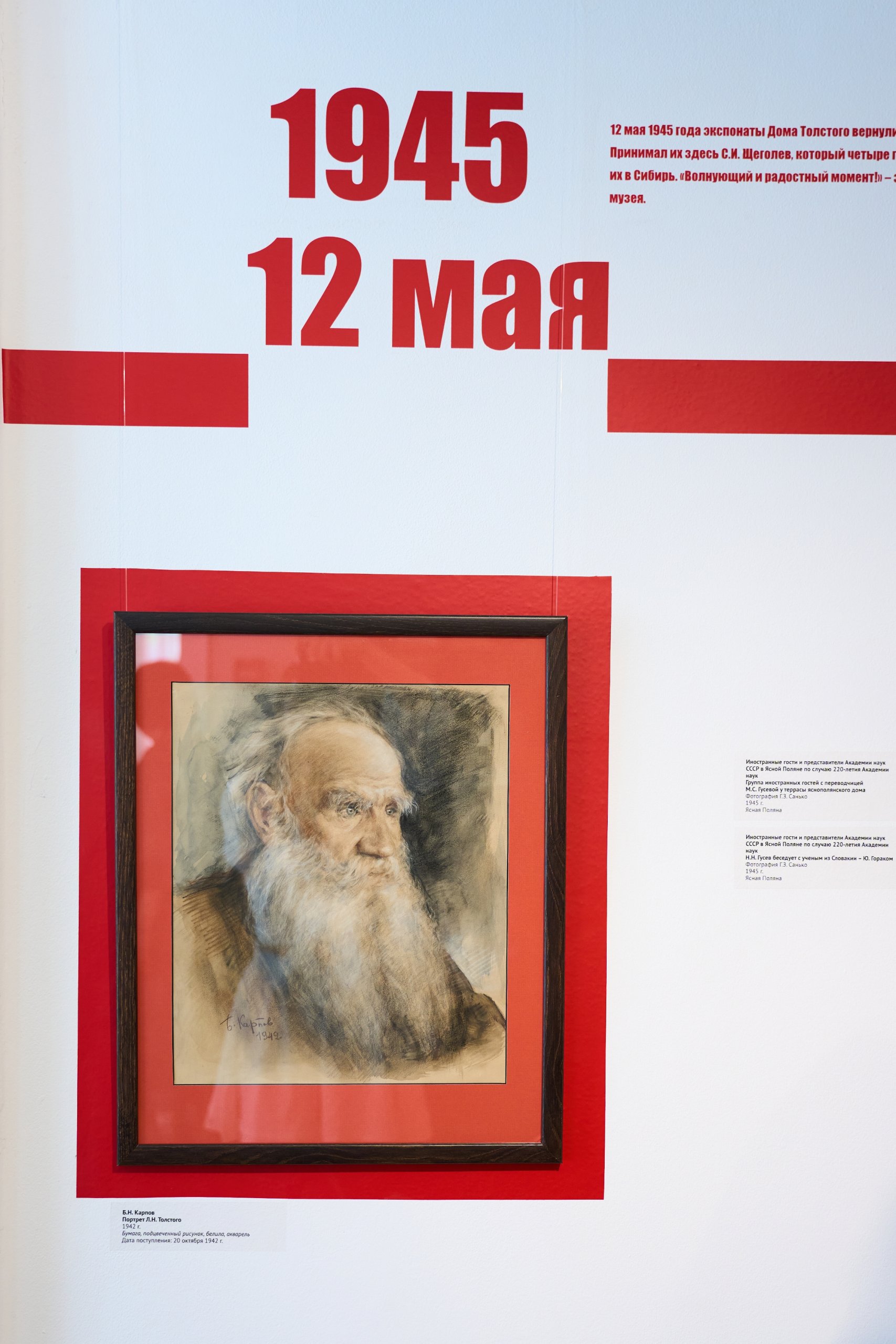 В четверг, 24 апреля, в Государственном музее Л.Н. Толстого на Пречистенке открылась выставка «Жизнь для победы и победа для жизни», приуроченная к 80-летию Победы в Великой Отечественной войне. Новая экспозиция стала частью масштабного проекта, посвященного мужественной работе сотрудников музея Льва Толстого в тяжелые военные годы. Кроме московского музея Льва Толстого, выставки, рассказывающие о героическом спасении толстовских реликвий, одновременно открылись в музее-усадьбе Л.Н. Толстого «Ясная Поляна» и Научной библиотеке Томского государственного университета.