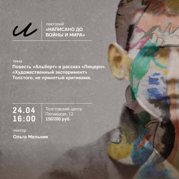 24 апреля (четверг), 16:00 Толстовский центр на Пятницкой, 12Купить билеты Лекторий на Пятницкой,12 «Написано до «Войны и мира». Ранние произведения Льва Толстого» познакомит посетителей с молодым начинающим писателем Львом Толстым и теми произведениями, которые, находясь в тени трех великих романов, мало известны широкому кругу читателей. Повествование научных сотрудников Государственного музея Льва Толстого подкрепляется новой экспозицией «Молодой…
