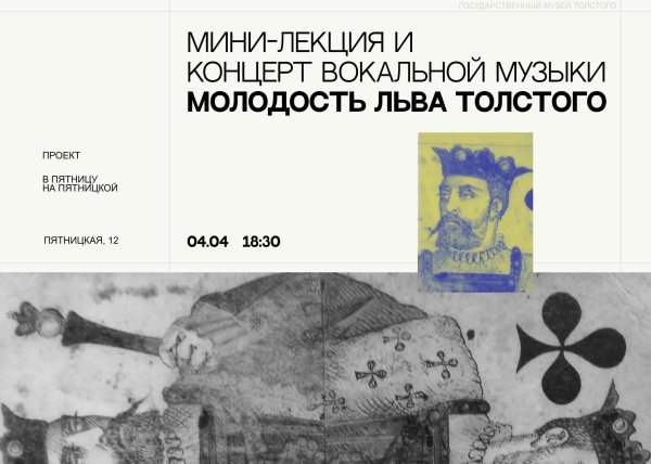 4 апреля (пятница), 18:30 Толстовский центр на ул. Пятницкой: г. Москва, ул. Пятницкая, д. 12 Вход по бесплатным билетам Мини-лекция и концерт «Молодость Льва Толстого» Концерт классической музыки в исполнении студентов музыкальных вузов. Вход по бесплатным билетам