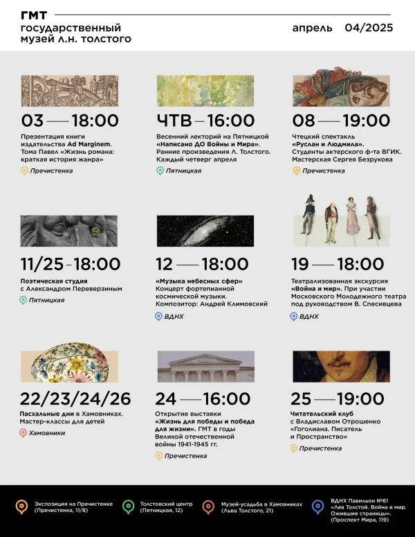 Апрель г. Москва, все филиалы нашего музея Представляем Вам афишу на самые интересные события во всех филиалах нашего музея. Подробнее о программе площадок: Литературная экспозиция на ул. Пречистенке: г. Москва, Пречистенка, д. 11/8 3 апреля (четверг), 18:00 Тома Павел «Жизнь романа: краткая история жанра» Презентация книги издательства Ad Marginem. В дискуссии примут…