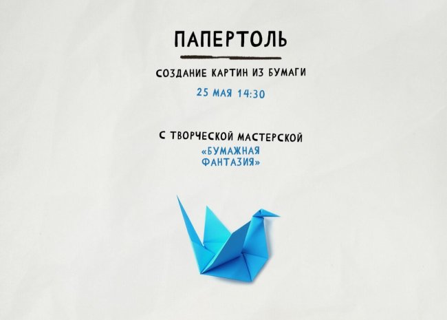 25 мая (воскресенье), 14:30 ВДНХ, павильон № 61 (г. Москва, пр-кт Мира, д 119) Вход по бесплатным билетам с возможностью предварительной регистрации (количество ограничено — 20 билетов):Зарегистрироваться Праздник птиц — в творческой мастерской «Бумажная фантазия»! В стиле папертоль — искусство создания объемных картин из бумаги — сотворим свои «пернатые» поделки.
