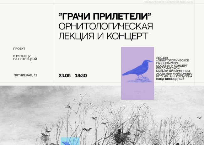 23 мая (пятница), 18:30 Толстовский центр на Пятницкой, 12 Вход по бесплатным билетам Уважаемые посетители! Мероприятие отменено.   Приглашаем на мини-лекцию «Грачи прилетели» об орнитологическом разнообразии Москвы и концерт классической музыки в исполнении солистов студенческой филармонии Академия Маймонида РГГУ им. А.Н. Косыгина. Благотворительный культурно-просветительский проект «В пятницу на Пятницкой»