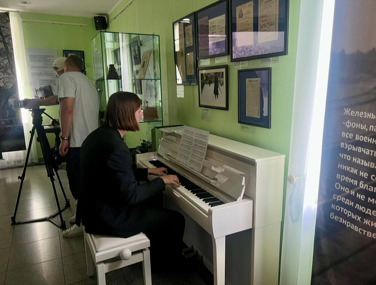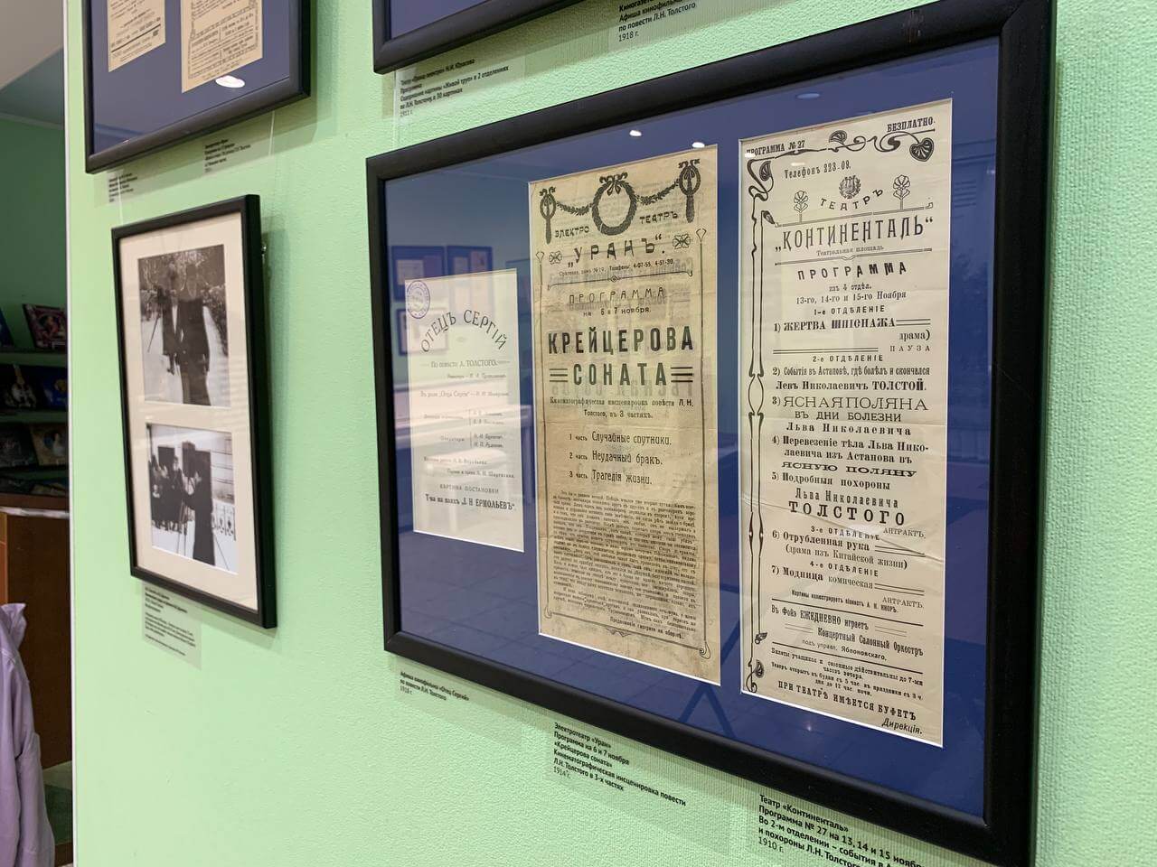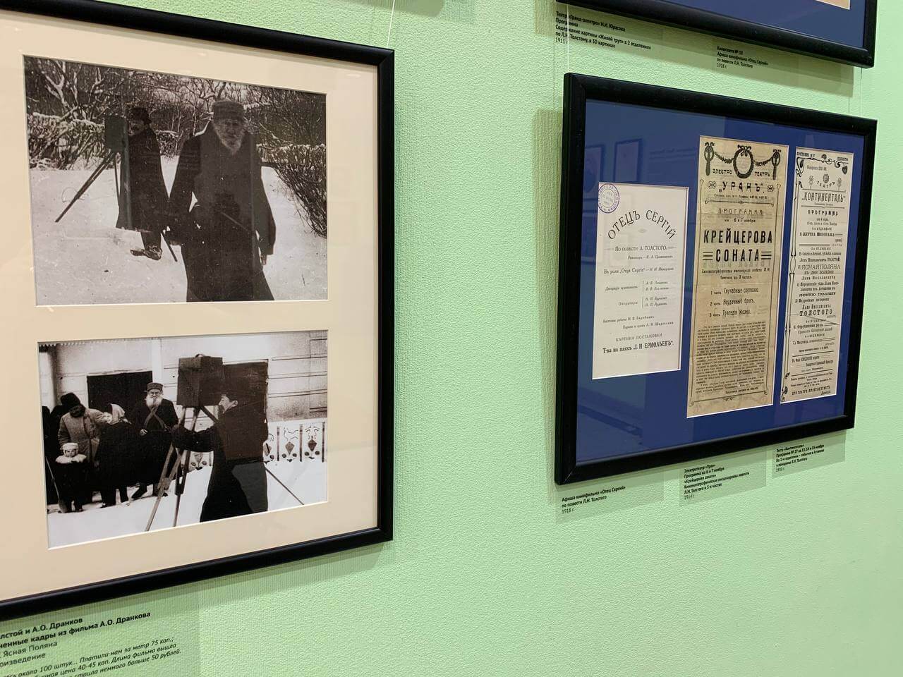 — Нам хотелось показать киносеанс времен Толстого, — рассказывает куратор выставки, старший научный сотрудник государственного музея Л.Н. Толстого Олеся Волосевич. — Кинотеатры начала ХХ века работали в сопровождении живой музыки. Там играли струнные оркестры, таперы, именно поэтому у нас на открытии за роялем Дмитрий Семин, специалист концертного отдела музея. Мы подбирали музыку, которая соответствует каждому тематическому фрагменту, она не случайна.