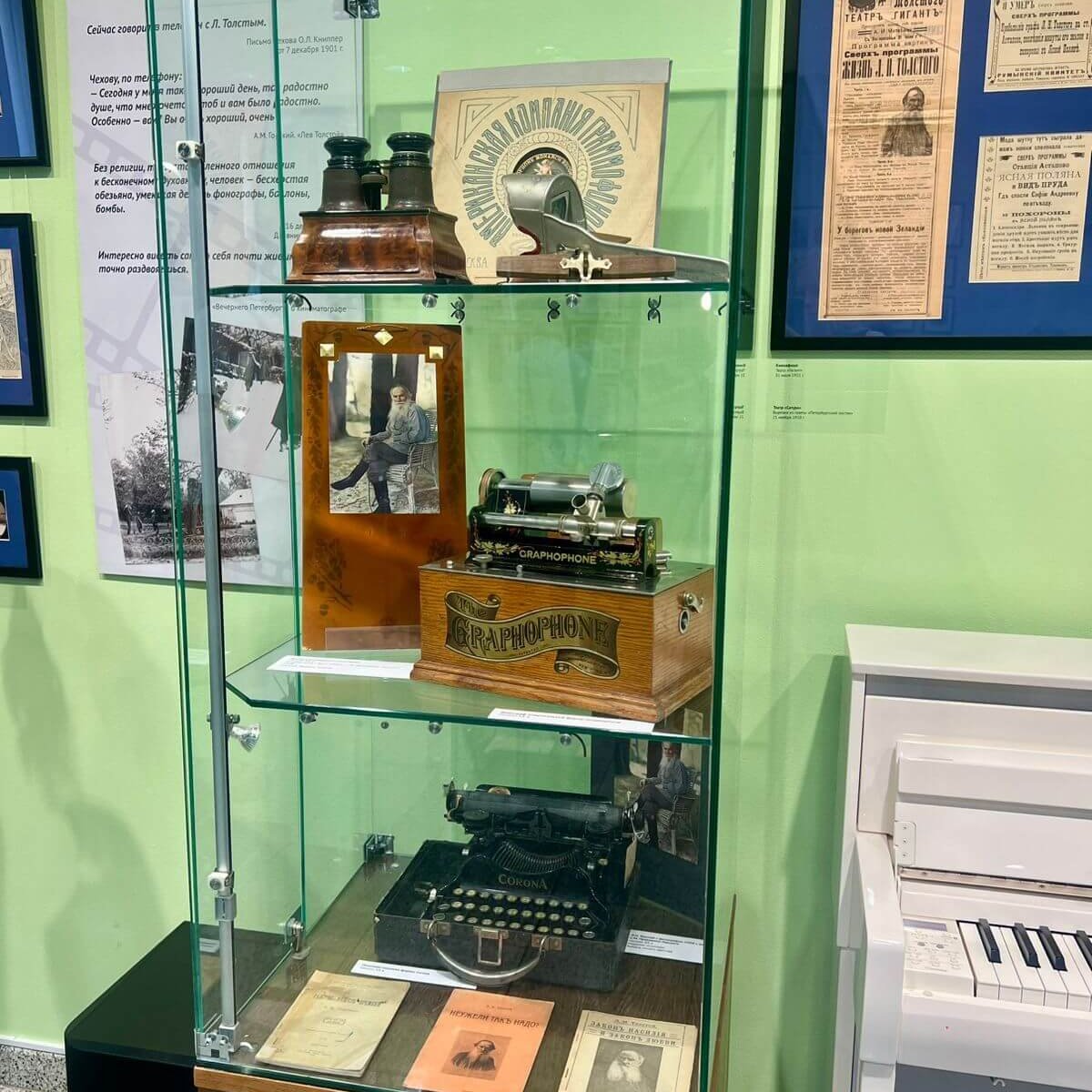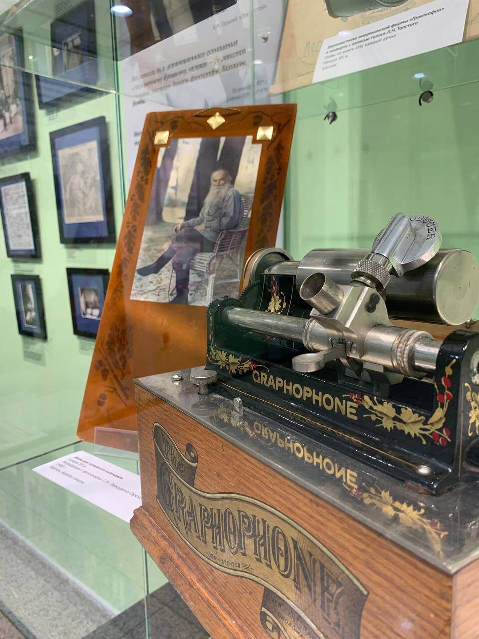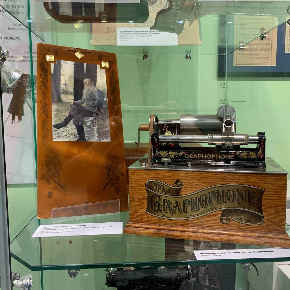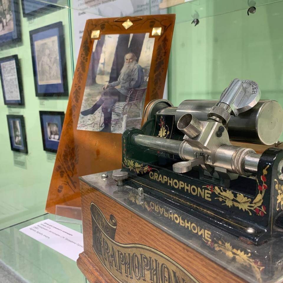 Благодаря фонографу, который был прислан Льву Николаевичу Томасом Эдисоном, мы можем послушать запись голоса писателя. На выставке представлен американский образец фонографа начала ХХ века.