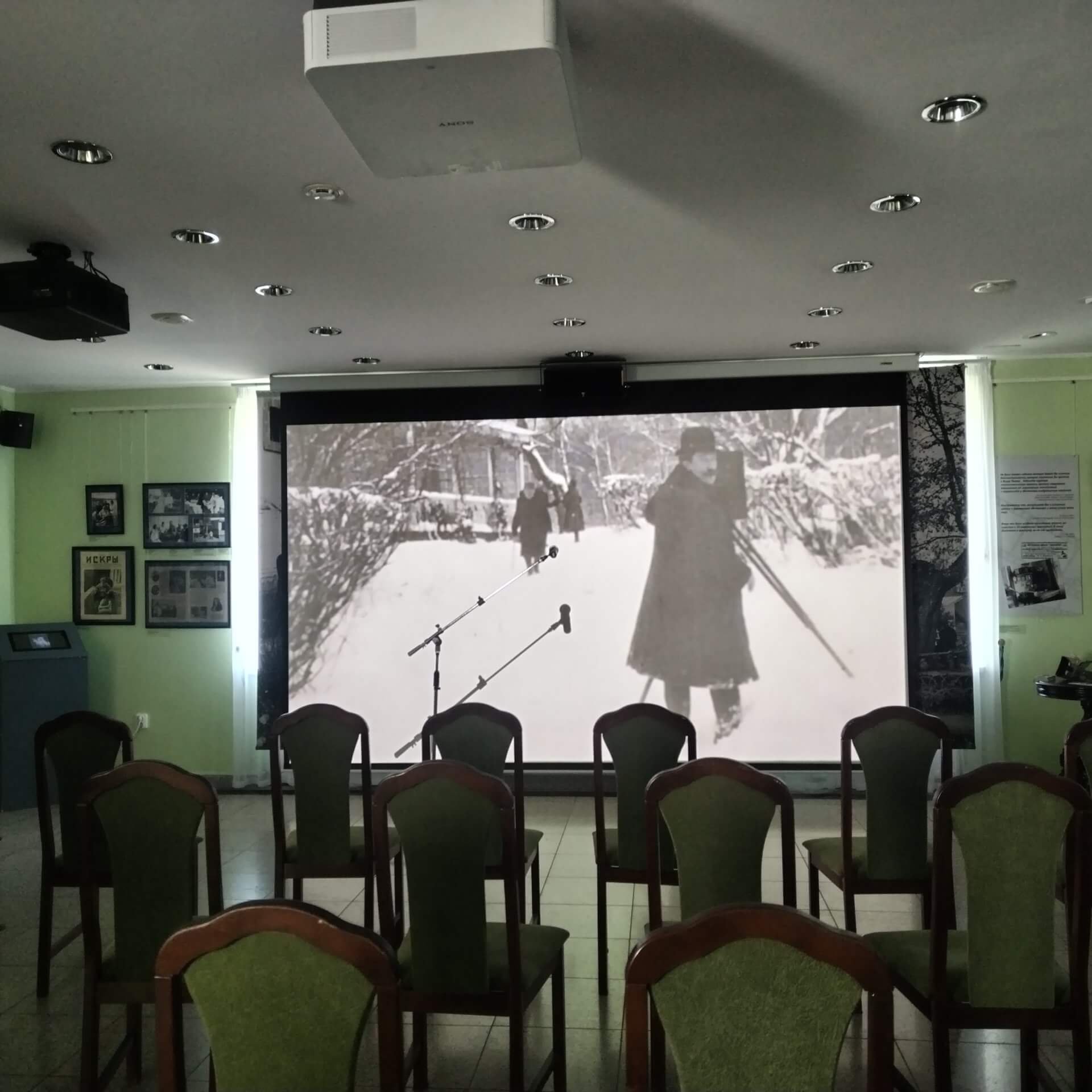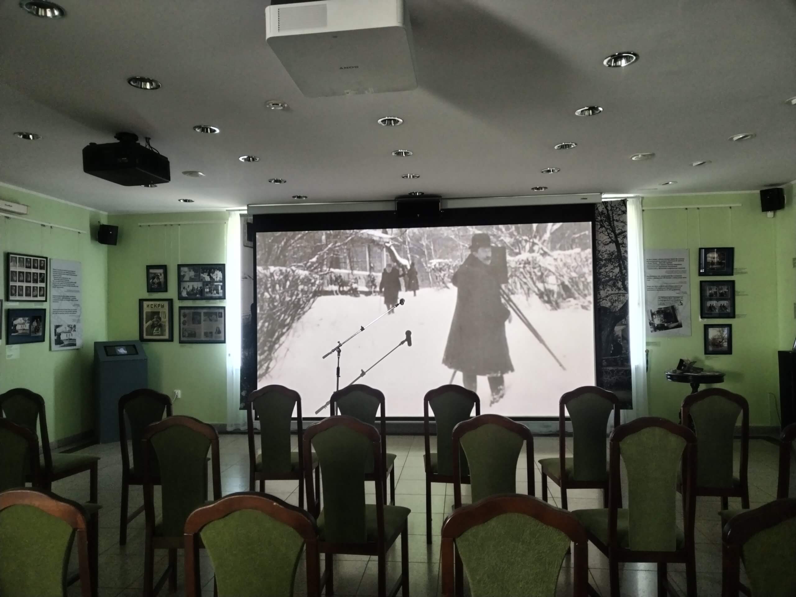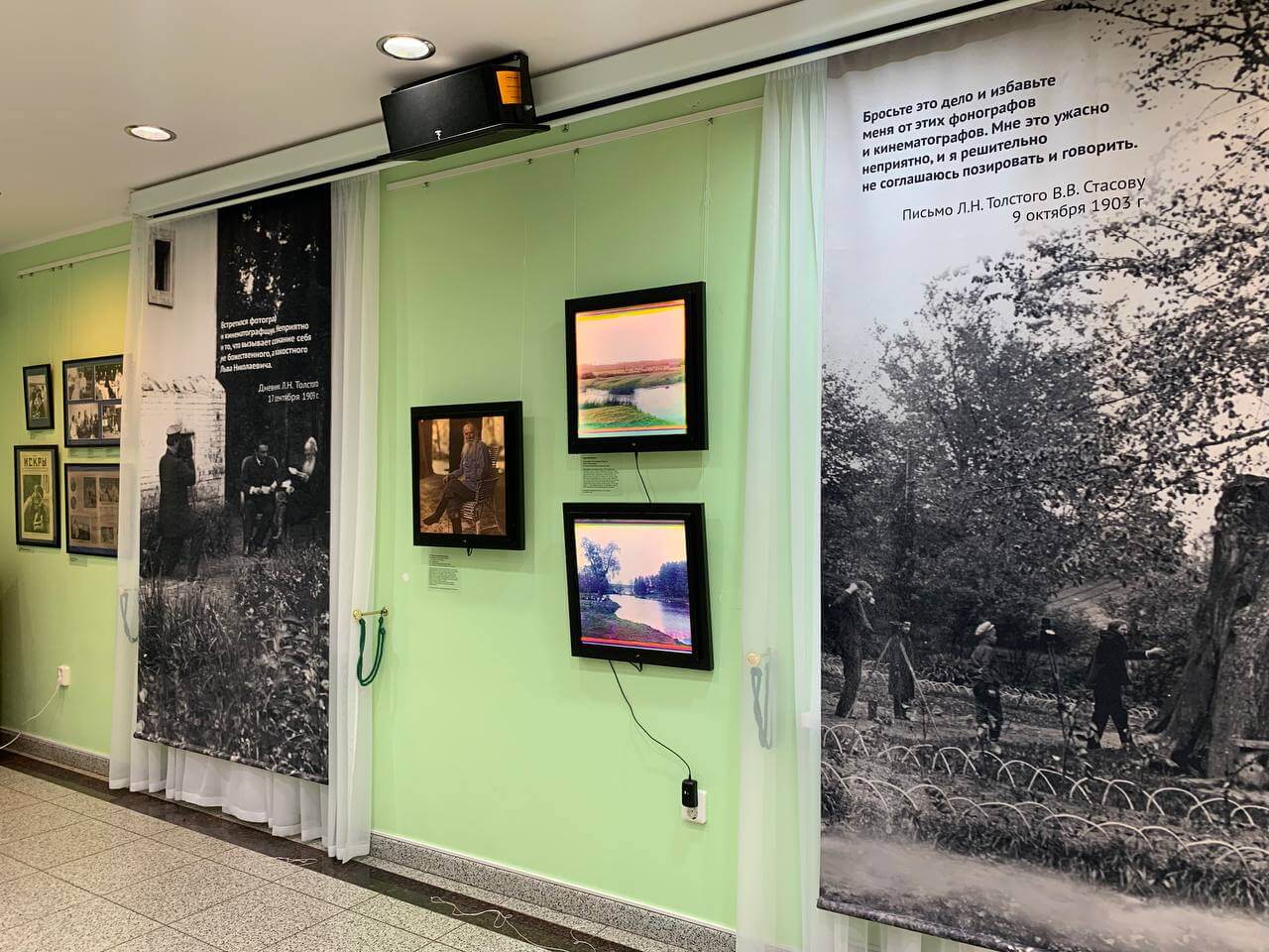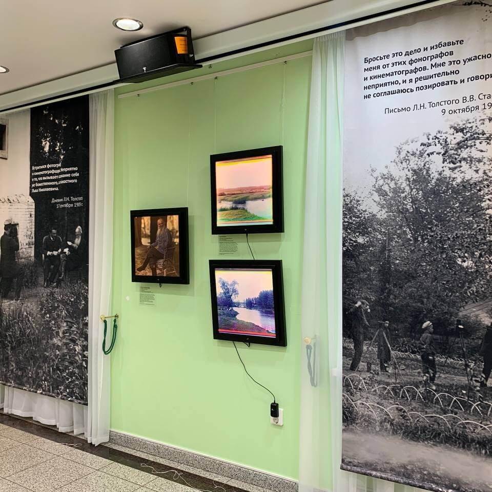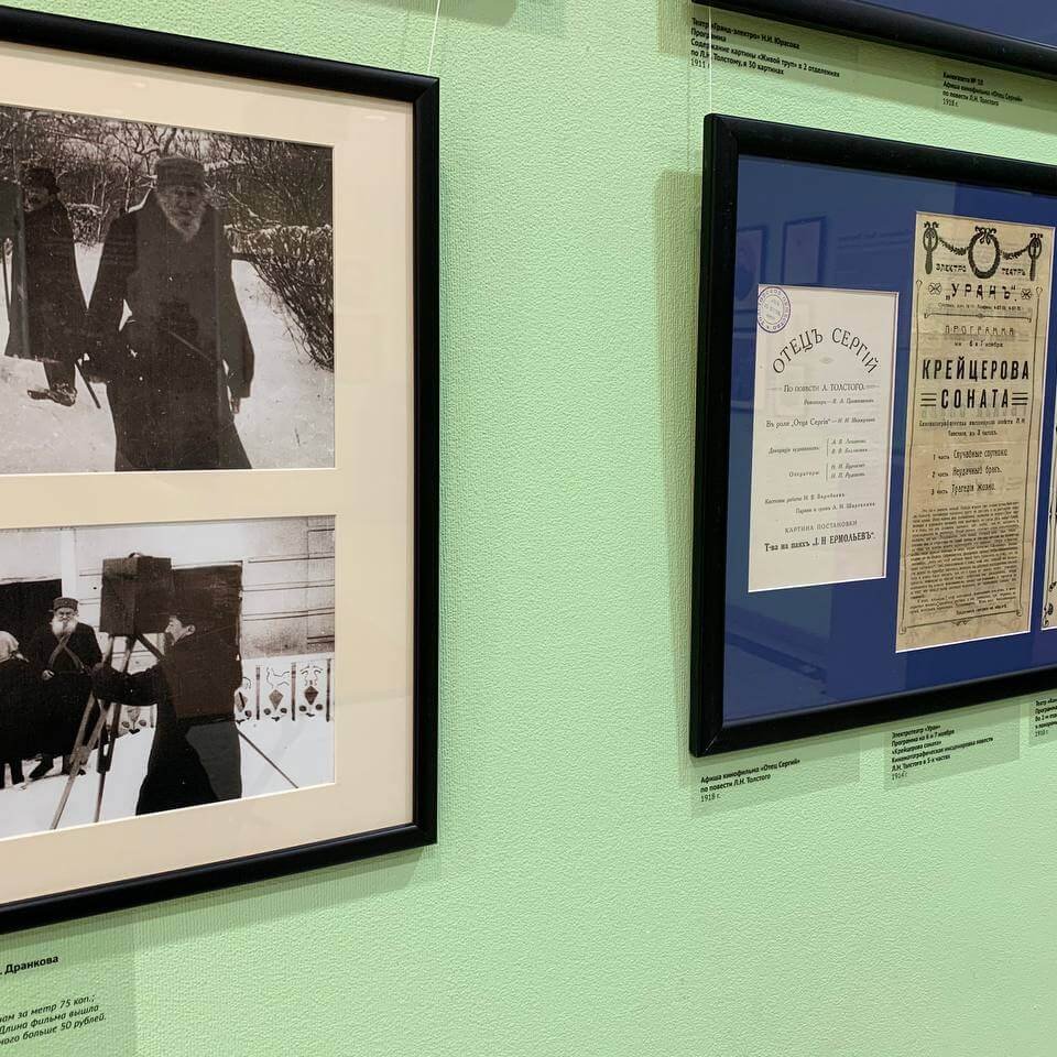 В основу выставки легла идея воспроизведения киносеанса начала ХХ века и первой встречи Толстого с синематографом, который он посещал множество раз.