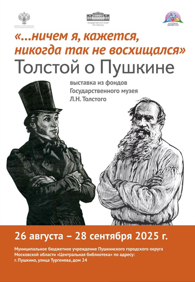 Выставка в Центральной библиотеке города Пушкино представляет вниманию посетителей иллюстрации к произведениям Толстого, письма к друзьям и фотографии семьи из собрания Государственного музея Л.Н. Толстого. Экспозиция позволяет проследить влияние Пушкина и осмысление его наследия Толстым, а также открыть неизвестные страницы литературной истории.