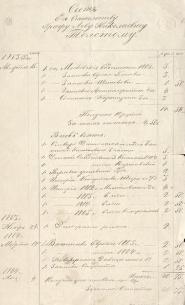 Более сотни изданий на русском и французском языках были просмотрены, прочитаны и изучены писателем в период работы над книгой «Война и мир». Об этом свидетельствует, например, счет книжного магазина за книги, приобретенные и взятые Л.Н. Толстым для прочтения в первые годы работы. В счете указаны даты: 15 августа и 24 ноября 1863 г., 19 марта и 9 мая 1864 г., 19 апреля 1865 г.