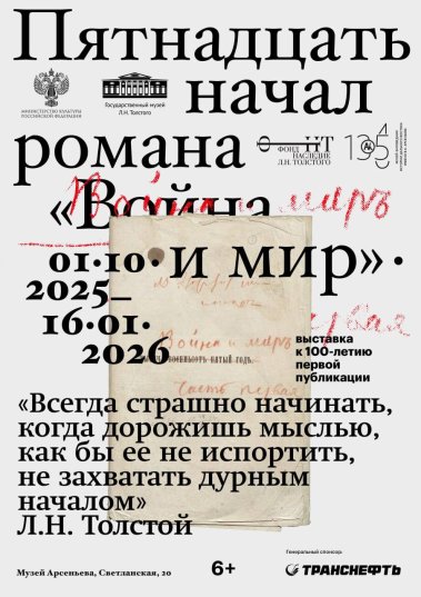 Выставка «Пятнадцать начал романа «Война и мир» посвящена работе Льва Николаевича Толстого над романом-эпопеей «Война и мир», длившейся с 1863 по 1869 годы, начиная от замысла и первых черновых набросков и до выхода публикации в печать. Фокус экспозиции же направлен на начальный период написания произведения, отражая эволюцию самосознания и мироощущения писателя в процессе работы, следы которой сохранились в рукописях и не дошли до печатного текста.