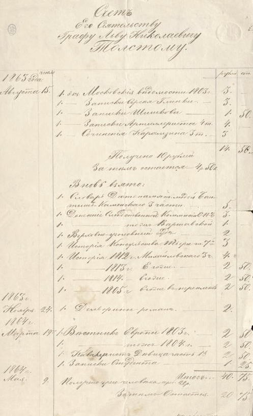 Более сотни изданий на русском и французском языках были просмотрены, прочитаны и изучены писателем в период работы над книгой «Война и мир». Об этом свидетельствует, например, счет книжного магазина за книги, приобретенные и взятые Л.Н. Толстым для прочтения в первые годы работы. В счете указаны даты: 15 августа и 24 ноября 1863 г., 19 марта и 9 мая 1864 г., 19 апреля 1865 г.