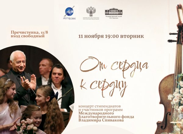 11 ноября (вторник), 19:00 Государственный музей Л.Н. Толстого (ул. Пречистенка, 11/8)Получить билеты Лауреаты международных конкурсов, стипендиаты и участники программ Международного Благотворительного фонда Владимира Спивакова представляют концерт «От сердца к сердцу», на котором будут исполнены произведения Ференца Листа, Пабло де Сарасте, Фридриха Швинделя, Сергея Рахманинова, Исаака Альбениса, Иоганна Себастьяна Баха, а также русские народные песни. Для…