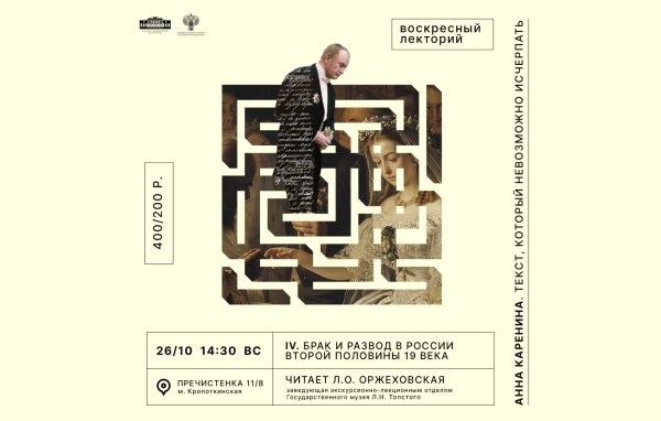 26 октября (воскресенье), 14:30 Государственный музей Л.Н. Толстого (ул. Пречистенка, 11/8)Купить билеты Одно из первых рабочих названий романа «Анна Каренина» — «Два брака». Что хотел этим сказать писатель? Насколько остро стояла тема развода, по сути разрушающего брак — «учреждение, составляющее основу всего общественного быта, как ядро развития цивилизации» (Д. И. Мейер), в обществе второй половины XIX века? Мы попытаемся понять, почему совершение…