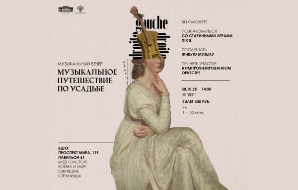 30 октября (четверг), 14:30 ВДНХ, павильон № 61 (Проспект Мира, 119, стр. 61)Купить билет В дни школьных каникул для наших юных посетителей мы приготовили познавательную программу «Музыкальное путешествие по усадьбе». Приглашаем посетить музыкальный вечер, на котором вы познакомитесь со старинными играми и образом жизни дворянских детей в XIX веке, послушаете живую музыку и сможете принять…