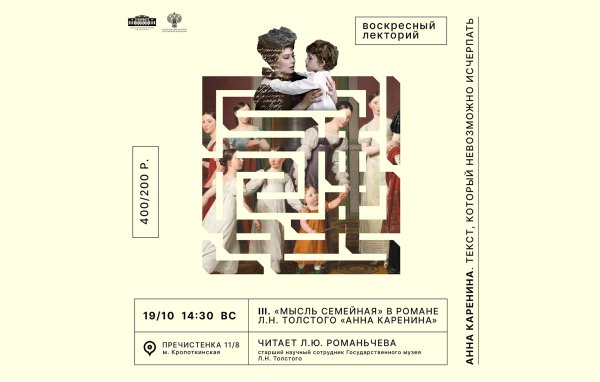 19 октября (воскресенье), 14:30 Государственный музей Л.Н. Толстого (ул. Пречистенка, 11/8)Купить билет Лекция посвящена главной мысли романа «Анна Каренина» — «мысли семейной». И хотя писатель называл свой роман «широким, свободным», все же тема семьи является стержневой и лежит в основе сюжета и поэтической композиции произведения. Именно через семью, ее духовную атмосферу Толстой раскрывает целую картину…