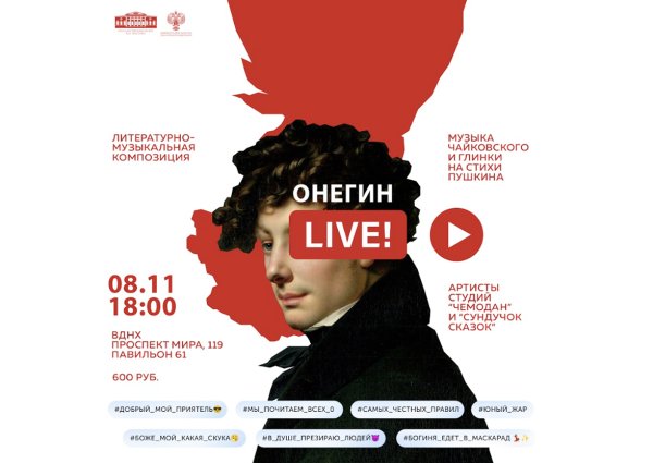 8 ноября (суббота), 18:00 ВДНХ, павильон № 61 (Проспект Мира, 119, стр. 61)Купить билет На концерте будет представлена литературно-музыкальная композиция, основанная на романе в стихах «Евгений Онегин» с исполнением вокальных классических произведений композиторов Петра Ильича Чайковского и Михаила Ивановича Глинки на стихи Александра Сергеевича Пушкина. В концерте принимают участие лауреаты международных и российских конкурсов, дипломанты…