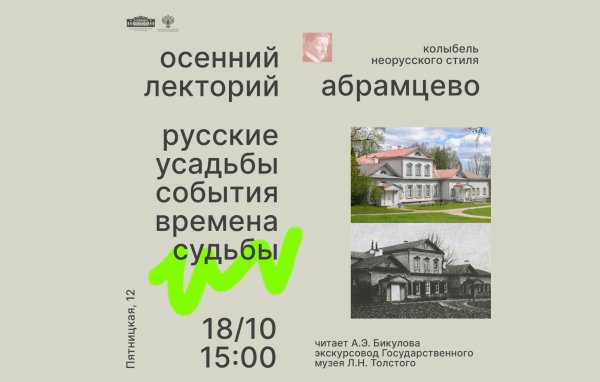 18 октября (суббота), 15:00 Толстовский центр на Пятницкой (ул. Пятницкая, 12)Купить билет Переступив порог Абрамцева, попадаешь в атмосферу Серебряного века. Каждый холм, каждое дерево помнит художников-передвижников и модернистов. В этой подмосковной усадьбе сплелись воедино черты народного промысла, русской сказки и европейского модерна. Промышленник Савва Мамонтов сделал Абрамцево художественной меккой: Виктор Васнецов написал здесь «Аленушку», Михаил Врубель создавал…