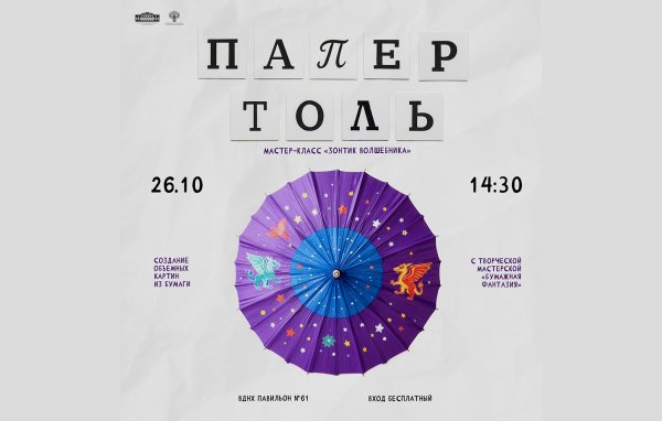 26 октября (воскресенье), 14:30 ВДНХ, павильон № 61 (Проспект Мира, 119, стр. 61)Купить билет Приглашаем на мастер-класс с мастерской «Бумажная фантазия», где вы создадите объемную открытку «Зонтик волшебника». Папертоль — это особая техника бумажного 3D-коллажа, пришедшая из Франции. Несколько одинаковых изображений вырезаются, собираются по слоям и «приподнимаются» с помощью клея и специальных подложек — так создаётся…