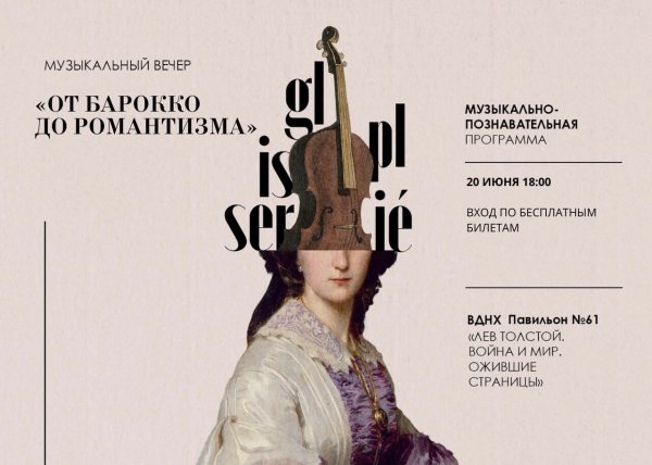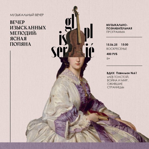 15 июня (воскресенье), 15:00 ВДНХ, павильон № 61 (г. Москва, пр-кт Мира, д 119) Цена билета: 400 руб.Купить билеты Приглашаем на музыкально-познавательную программу «Вечер изысканных мелодий. Ясная Поляна». Погрузитесь в атмосферу XIX века: фортепианные пьесы, звучавшие в доме Толстых, рассказы о семье, письмах и музыкальных вкусах, а также дворянские игры, «чайные споры» и живое общение.…