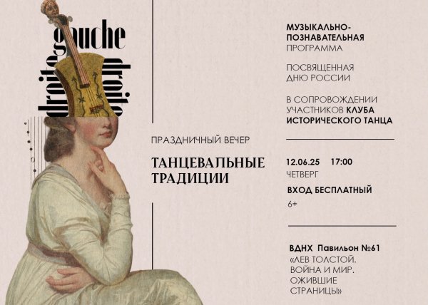 12 июня (четверг), 17:00 ВДНХ, павильон № 61 (г. Москва, пр-кт Мира, д 119) Вход по бесплатным билетам:Приобрести билеты Праздничный вечер «Танцевальные традиции» — музыкально-познавательная программа, посвященная Дню России 12 июня, в сопровождении участников клуба исторического танца. С 11:00 до 20:00 — бесплатный вход на экспозицию «Лев Толстой. Война и мир. Ожившие страницы». В 17:00…