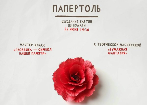 22 июня (воскресенье), 14:30 ВДНХ, павильон № 61 (г. Москва, пр-кт Мира, д 119) Вход по бесплатным билетам:Приобрести билеты 22 июня – День памяти и скорби, годовщина начала Великой Отечественной войны.В этот день творческая мастерская «Бумажная фантазия» предлагает вам почтить память защитников Отечества, своими руками создав трогательный символ – объёмные гвоздики. Мы приглашаем всех желающих – детей и взрослых –…