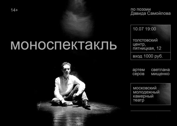 10 июля (четверг), 19:00 Толстовский центр на Пятницкой, 12 Цена билета: 1000 руб.Купить билеты Уважаемые посетители! По техническим причинам данное мероприятие ОТМЕНЕНО! Приносим свои извинения за доставленные неудобства. Московский молодежный камерный театр представляет моноспектакль по поэзии Давида Самойлова «Неужто только ради красоты?» Спектакль-предлог. Предлог, чтобы окунуться в воспоминания, закрыть глаза и вспомнить, как это было: папа, мама,…