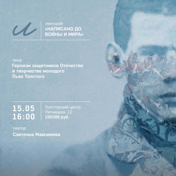 15 мая (четверг), 16:00 Толстовский центр на Пятницкой,12 Цена билета: 150/200 руб.Купить билеты Тема: героизм защитников Отечества в творчестве молодого Льва Толстого Лекторий на Пятницкой,12 «Написано до «Войны и мира». Ранние произведения Льва Толстого» познакомит посетителей с молодым начинающим писателем Львом Толстым и теми произведениями, которые, находясь в тени трех великих романов, мало известны широкому кругу читателей.…