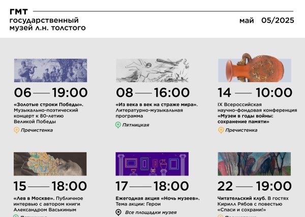 Май г. Москва План мероприятий, которые пройдут на московских площадках Государственного музея Л.Н. Толстого в мае: Дата/Время Мероприятие Место проведения/Билеты 2 мая (пятница) 18:00 Лекция-концерт «Толстовский плейлист» Исполнитель: камерный ансамбль в составе Олеся Волосевич (флейта), Дмитрий Сёмин (фортепиано), Константин Шмырев (виолончель) В программе произведения любимых композиторов Л.Н.Толстого. Ведет программу и рассказывает – научный сотрудник…