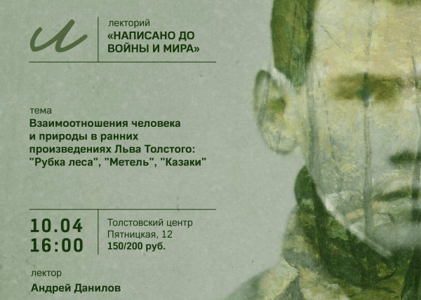 10 апреля (четверг), 16:00 Толстовский центр на Пятницкой-12 (ул. Пятницкая, д. 12) 2 лекция: «Взаимоотношения человека и природы в ранних произведениях Льва Толстого: «Рубка леса», «Метель», «Казаки»» Лектор — старший научный сотрудник Андрей Данилов.   Какова роль природы в произведениях писателей? Какую дорогу, рассказывая о природе, избрал для себя Лев Толстой? Стороннего наблюдателя или активного…