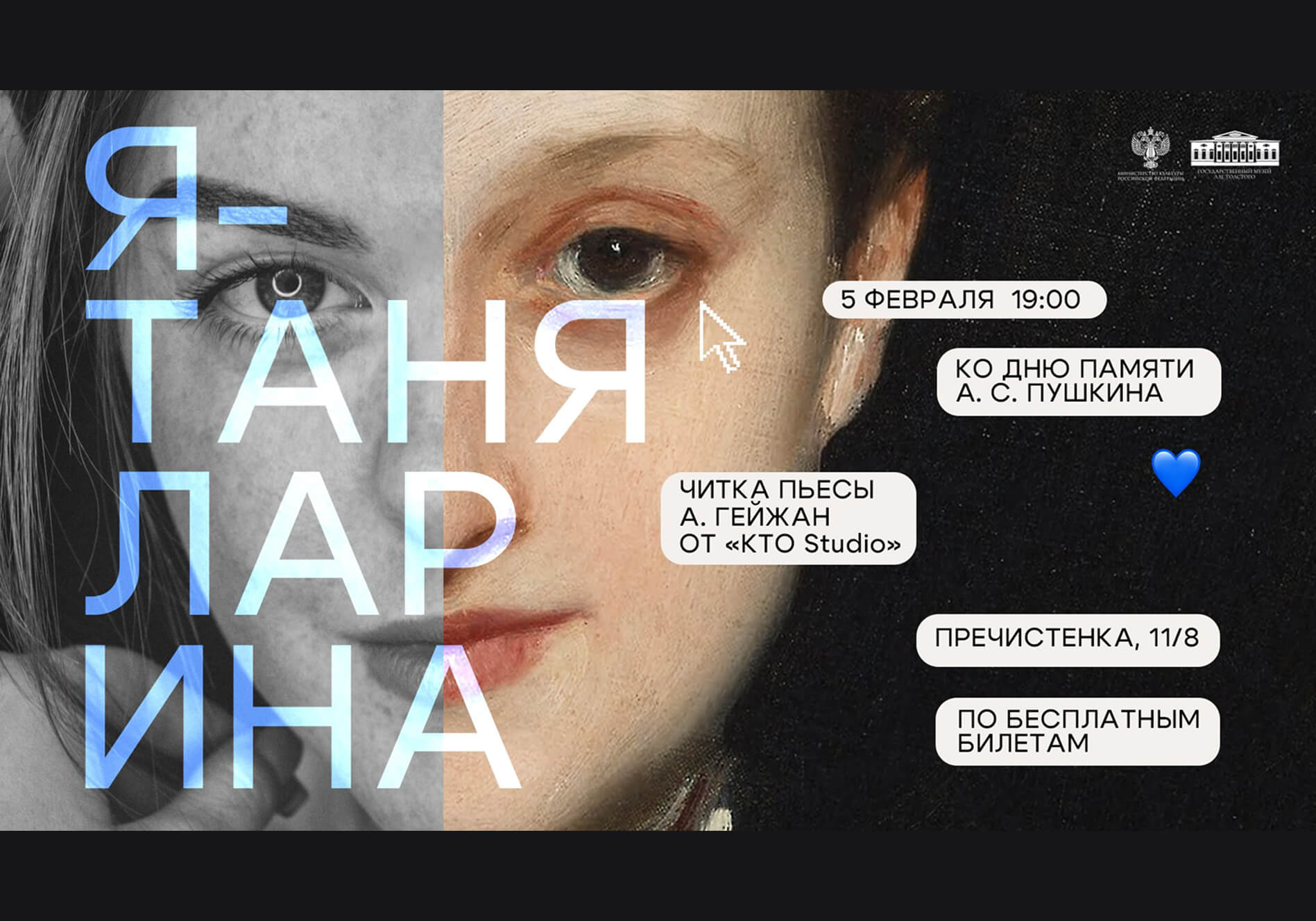 Театр «КТО Studio» хочет доказать, что Солнце русской поэзии не угасает в молодых сердцах. Представьте: Таня Ларина живет на Камчатке, учит билеты к ЕГЭ и спорит с Пушкиным, а её сестра Оля уверена, что их с сестрой назвали неправильно, ведь это она влюблена в популярного блогера Женю и пишет ему любовное письмо. Театр «КТО Studio» представляет читку пьесы Анны Гейжан «Я — Таня Ларина». Это ироничная и нежная рефлексия на тему романа «Евгений Онегин», перенесенная в реалии современной России.