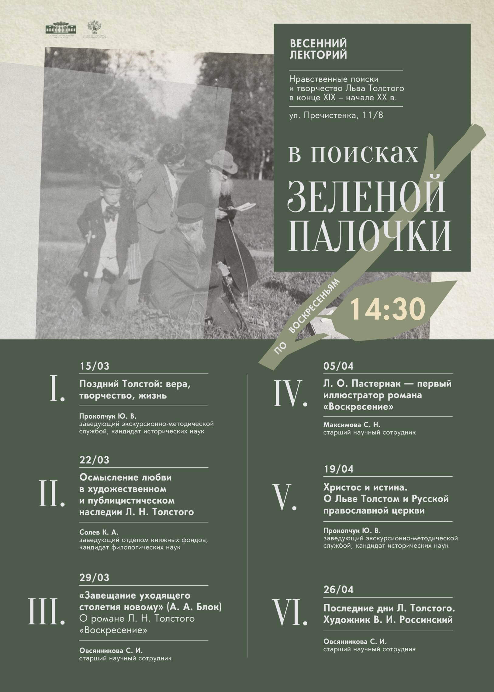 Тема весеннего лектория сезона март-апрель 2026 года: «В поисках зеленой палочки. Нравственные поиски и творчество Льва Толстого в конце XIX – начале XX века».