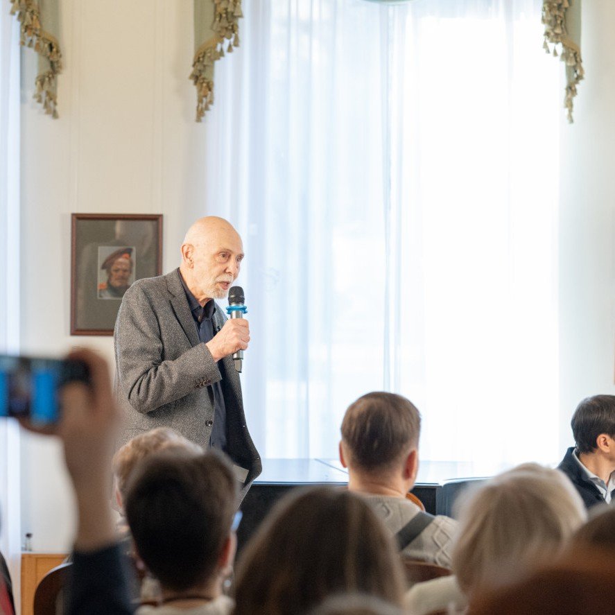 В отличие от Рубанова, прочитавшего публике двадцатиминутный отрывок из грядущего романа, Юзефович читать не захотел. Здесь сказывается личный подход: Леонид Абрамович считает, что чтение текста на публику провоцирует сонливость. Аудитории был предоставлен QR-код, пройдя по которому, можно было прочесть целиком новый, еще не опубликованный рассказ «Монастырь безмятежной радости». Было жаль остаться без чтения Леонидом Абрамовичем хотя бы фрагмента. Ведь тембр его голоса близок степенно-эпическому духу его прозы: вспомним недавнюю книгу «Мемуар. Стихи и переводы. 1965–2023», аудиоверсию которой автор исполнил самостоятельно.