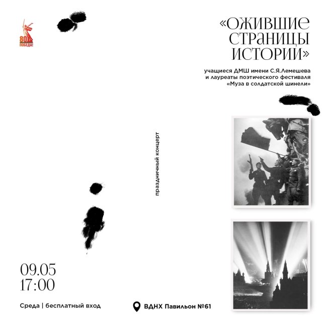 9 мая (пятница), 17:00 ВДНХ, павильон № 61 (г. Москва, пр-кт Мира, д 119) Вход по бесплатным билетам Приглашаем на музыкально-поэтический концерт Детской музыкальной школы имени оперного певца Сергея Лемешева — уникальной школы, созданной Еленой Гнесиной в конце 40-х годов XX века при поддержке Государственного музея Л.Н. Толстого. В праздничном концерте примут участие обладатели Гран-при…