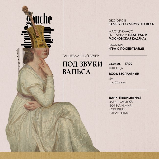 25 апреля (пятница), 17:00 ВДНХ, павильон № 61 (г. Москва, пр-кт Мира, д 119) Окунемся в атмосферу балов ХIX века на танцевальном вечере «Под звуки вальса»! Вас ждут популярные исторические танцы, интересные факты о бальной культуре и мастер-класс по танцам падеграс и московская кадриль. Ведущие танцевального вечера — Анатолий Воронин и Галина Александрова, лауреаты международных…