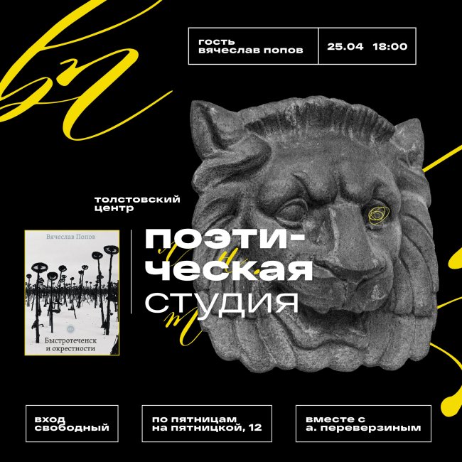 25 апреля (пятница), 18:00 Толстовский центр на Пятницкой, 12 Приглашаем на занятие поэтической студии на Пятницкой под руководством Александра Переверзина! Гостем встречи станет поэт, редактор, издатель Вячеслав Попов. Вячеслав Попов родился в 1966 году в Смоленской области. Окончил школу в Бийске (Алтайский край). Учился в Новосибирском, а затем в Тартуском университете. С 1994 года занимался…