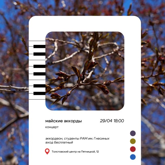 29 апреля (вторник), 18:00 Толстовский центр на Пятницкой, 12 Вход по бесплатным билетам Студенты Российской академии музыки им. Гнесиных выступят в Толстовском центре на Пятницкой! Аккордеонисты класса Марии Власовой — преподавателя, дирижера оркестровых народных инструментов, концертной исполнительницы, постоянной участницы российских и международных конкурсов – примут участие в праздничном концерте «Майские аккорды». В этот вечер для…