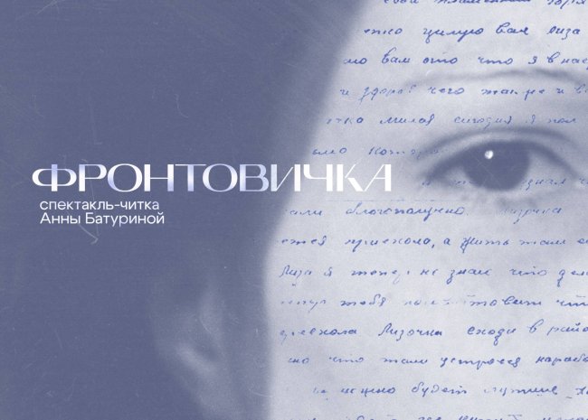 21 июня (суббота), 18:00 ВДНХ, павильон № 61 (г. Москва, пр-кт Мира, д 119) Вход по бесплатным билетам:Приобрести билеты Творческое пространство «Театр + кино = …» представляет спектакль-читку пьесы Анны Батуриной «Фронтовичка». Участники творческого объединения — студенты курса Антона Горюнова Московского Государственного института культуры. В спектакле занята заслуженная артистка Республики Бурятия Анастасия Турушева.