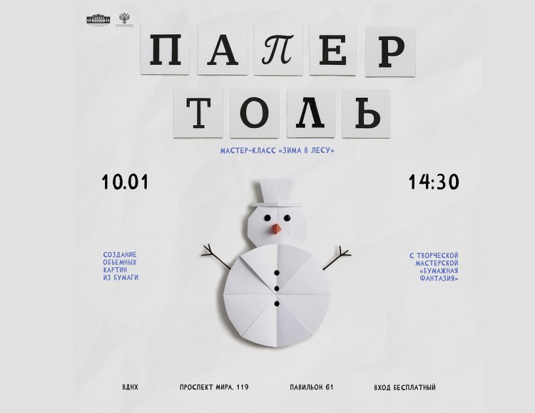 10 января (суббота), 14:30 ВДНХ, павильон № 61 (Проспект Мира, 119, стр. 61)Получить билет Приглашаем на мастер-класс мастерской «Бумажная фантазия», где вы научитесь создавать объемные картины в технике папертоль. Папертоль — это особая техника бумажного 3D-коллажа, пришедшая из Франции. Несколько одинаковых изображений вырезаются, собираются по слоям и «приподнимаются» с помощью клея и специальных подложек —…