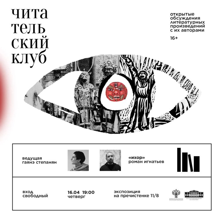 16 апреля (четверг), 19:00 Государственный музей-заповедник Л.Н. Толстого (Москва, ул. Пречистенка, 11/8)Получить билет Специальный гость – писатель Роман Игнатьев, Обсуждаем роман «Ихор» – динамичный мистический триллер, в котором события разворачиваются в двух временных промежутках — наши дни и Гражданская война после революции. Роман вошел в длинный список премии «Лицей». Ведущая: Гаянэ Степанян. Вас ждет живое…