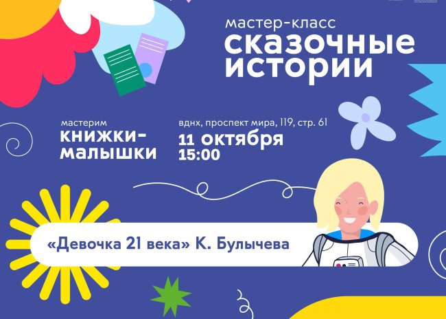 11 октября (суббота), 15:00 ВДНХ, павильон № 61 (Проспект Мира, 119, стр. 61)Получить билет Приглашаем детей 1-2 классов на мастер-класс «Сказочные истории» с просмотром диафильма «Девочка из XXI века» по книге Кира Булычева. Просмотр диафильмов — это уникальный формат, который сочетает пользу чтения, театра и мультфильмов. Медленный темп смены кадров, отсутствие готовой «озвучки» – все…